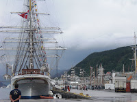 Om daarna ons weg te vervolgen richting Florø en het eiland Bremanger. Onderweg veelbelovend een bord met wat er allemaal te zien is aan deze doodlopende weg. "Als je iets mist ga je dus altijd de terug weg voor de herkansing". Ook stond erop vermeld dat er langs de route Hytte's te huur waren, leuk om te weten als je niets gepland hebt. De route was prachtig en na ongeveer een uur rijden waren we aan het eind. En nog mooier, weer een bord met een telefoon nr. voor meer informatie over overnachtingen. Dus maar even bellen met Alex (geen Noorse naam) en in mijn beste Noors gevraagd of er nog ergens een Hytte vrij was. Krijg ik een weifelende wedervraag of ik toevallig Nederlands ben, ja dus en Alex ook. Alleen diende zich het volgende probleem aan dat alle hutjes (2 in totaal)al vol waren. Maar als we even terug reden en bij het dorpje Botnane naar het blauwe huis zouden gaan dan zou hij voor ons kijken of er nog wat te regelen viel. Zo gezegd zo gedaan en dus kennis gemaakt met Alex en Jaquelien en hun 5 dochters die hier al 6 jaar wonen. Ook werd hier al snel de oplossing gevonden voor ons "slaapprobleem" ze hadden net de tent in de tuin gezet voor hun meiden maar voor een nacht konden wij hier wel bivakeren. Een riante stek met een riant uitzicht.